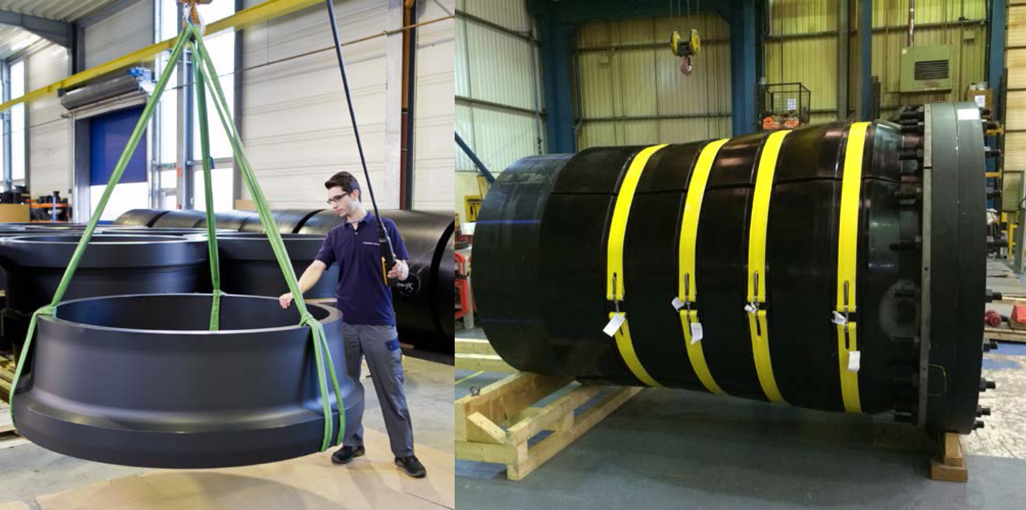 Figure 2: Left: completed stub end at Reinert-Ritz right: stub end, complete with steel encapsulation, pipe extension and bracing. [Source: Reinert-Ritz GmbH]This unique PE project starts in the immediate vicinity of the Taşucu containment basin. Here, the 500 mm lengths of PE 100 pressure pipe sections, with an outside diameter 1,600 mm, have already been under production for many months. Three extrusion machines have been operating in parallel in this purpose-built facility. This system not only achieves cost benefits, but also for many projects, it provides an assurance factor both desirable and in many cases mandatory. The pipe length results from the fact that PE pipes, due to their specific gravity of less than 1 g/cm3, would normally float on the surface of the water. This fact, in combination with the lower relative density of freshwater compared to seawater, causes enormous positive buoyancy forces. These are counteracted by the pipe joining yokes, each consisting of two flanged connectors and a steel pipe bend to which the flanged connector is fixed. The steel yokes have an outside diameter of 1,514 mm, a curvature radius of 8,000 mm with a bend angle of 30°, and weigh around 10 tonnes without the connecting elements. Total weight including the two connecting elements is around 13 tonnes. The steels yokes, which also act as fixing and anchoring points, are subsequently drawn down to a depth of 250 m by means of steel cables and then anchored to the seabed (Figure 1), illustrating even better the special features of this project.