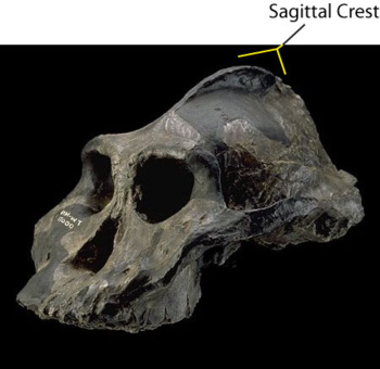 The Sagittal Crest is a ridge of bone running lengthwise along the midline of the top of the skull. The presence of this ridge of bone indicates that there are exceptionally strong jaw muscles. The sagittal crest serves primarily for attachment of the temporalis muscle, which is one of the main chewing muscles. It is absent or greatly reduced in most Hominins (with the notable exception of the Paranthropus genus)."
